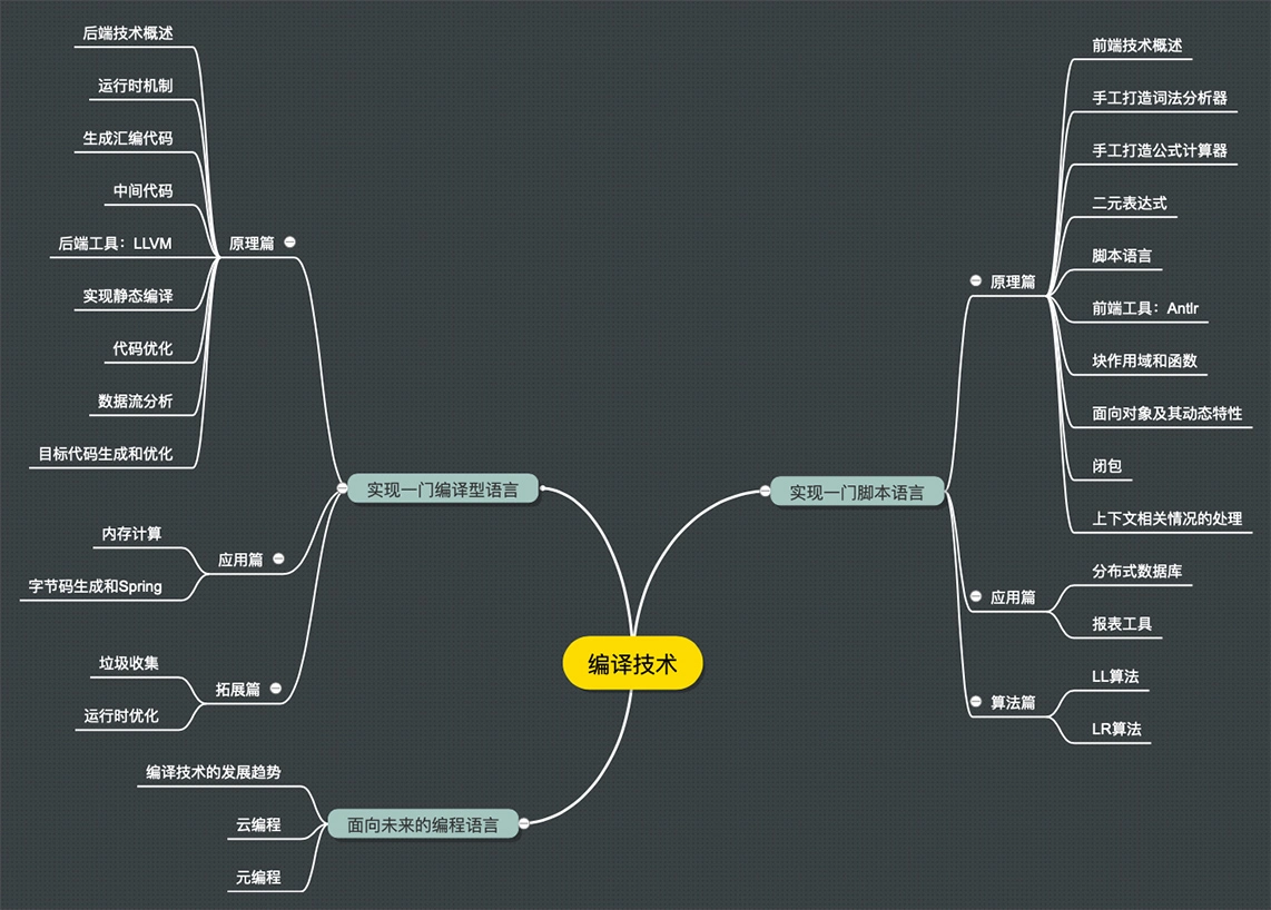 为了帮你迅速了解课程的知识结构体系,我画了一张思维导图。课程从三方面展开,包括实现一门脚本语言、实现一门编译型语言和面向未来的编程语言。