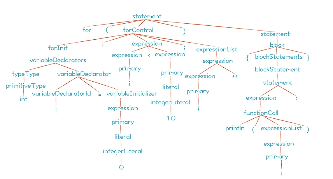 从上面的语法规则中看到,for语句归根到底是由语句、表达式和变量声明构成的。代码中的for语句,解析后形成的AST如下: