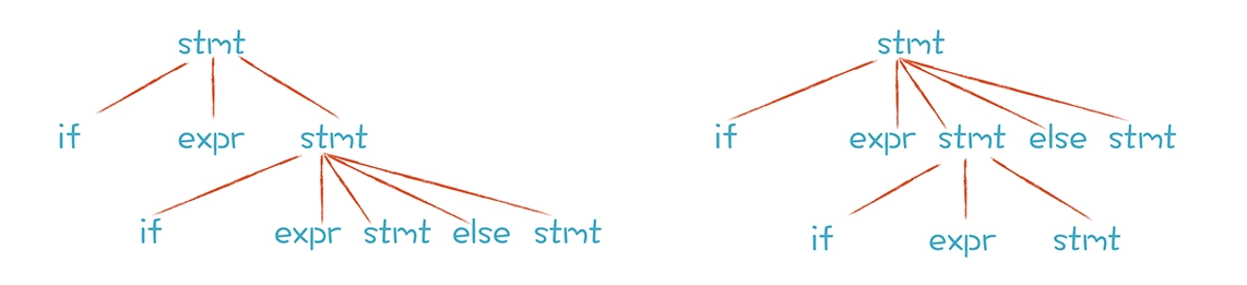 按照这个语法规则,先采用第一条产生式推导或先采用第二条产生式推导,会得到不同的AST。左边的这棵AST中,else跟第二个if配对;右边的这棵AST中,else跟第一个if配对。
