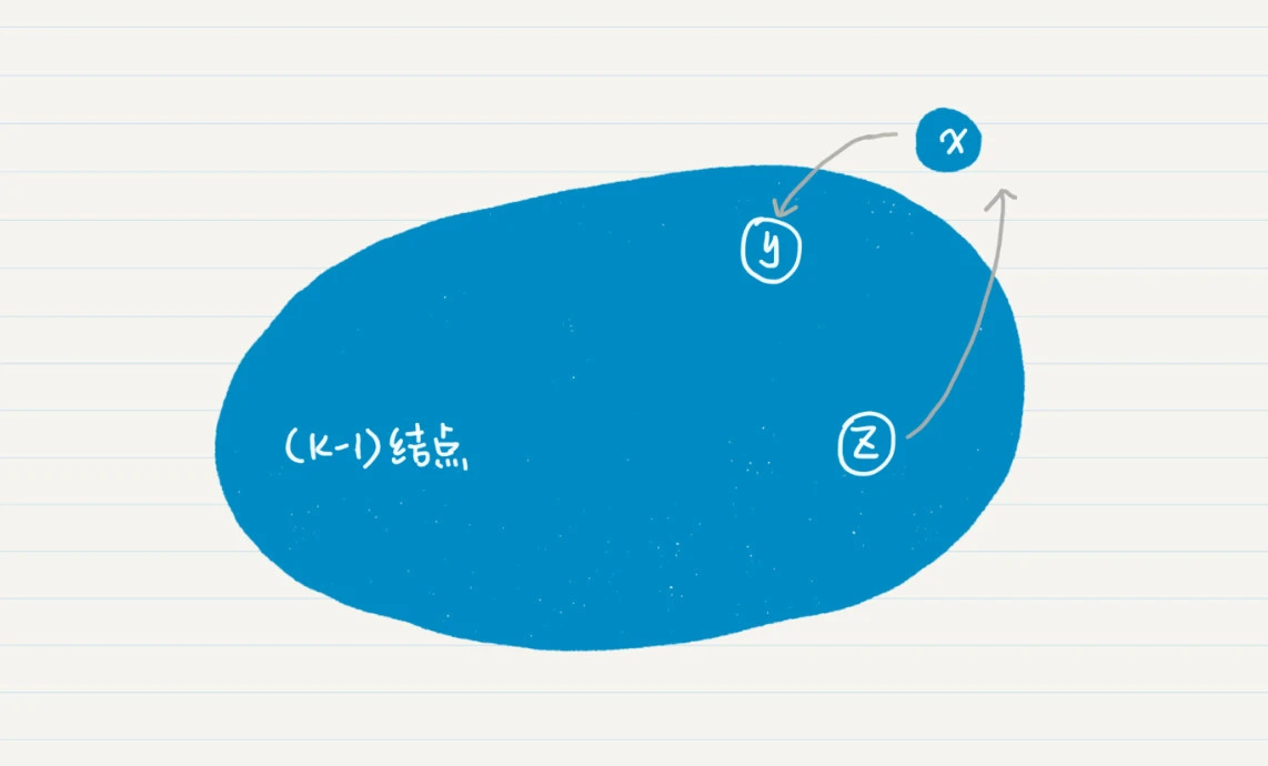 这里我们只需要考虑x和这k-1个点连通的情况。因为如果不连通,就没有必要考虑x了。既然连通,x可能会指向之前k-1个结点,也有可能被这k-1个结点所指向。假设x指向了y,而z指向了x,y和z都是之前k-1个结点中的一员。