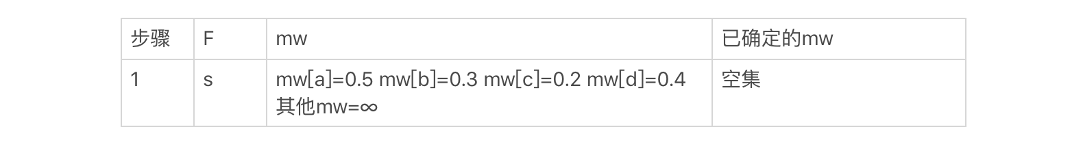 我们把结点s放入集合F。同s直接相连的结点有a、b、c和d,我把它们的mw更新为w数组中的值,就可以得到如下结果: