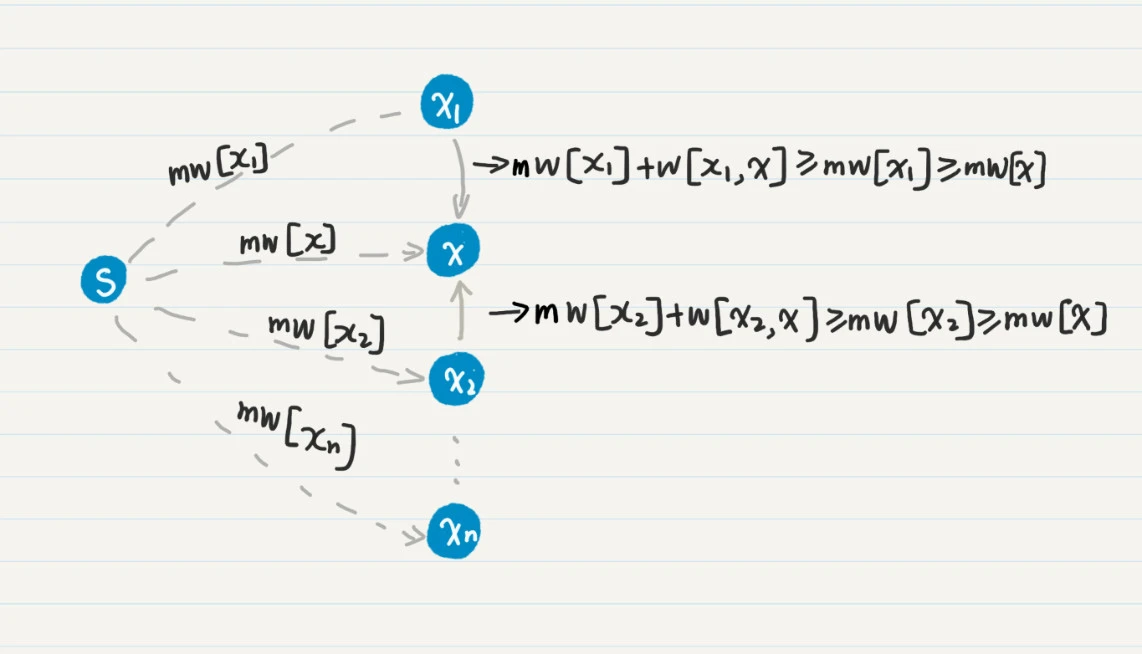 图中的虚线表示省去了通路中间的若干结点。mw[x]是当前mw数组中的最小值,所以它小于等于任何一个mw[xn],其中xn不等于x。
