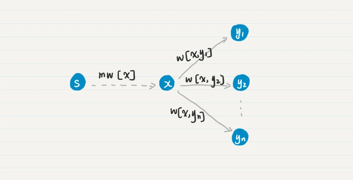 在这个图中,x直接相连$y_{1}$,$y_{2}$,…,$y_{n}$。从点s到点x的mw[x]已经确定了,那么对于从s到yn的所有通路,只有两种可能,经过x和不经过x。如果这条通路经过x,那么其权重的最小值就是mw’[$y_{i}$] = mw[x] + w[x, $y_{i}$]中的一个(1≤i≤n),我们只需要把这个值和其他未经过x结点的通路之权重对比就足够了。这就是为什么每次要更新和x直接相连的结点之mw。