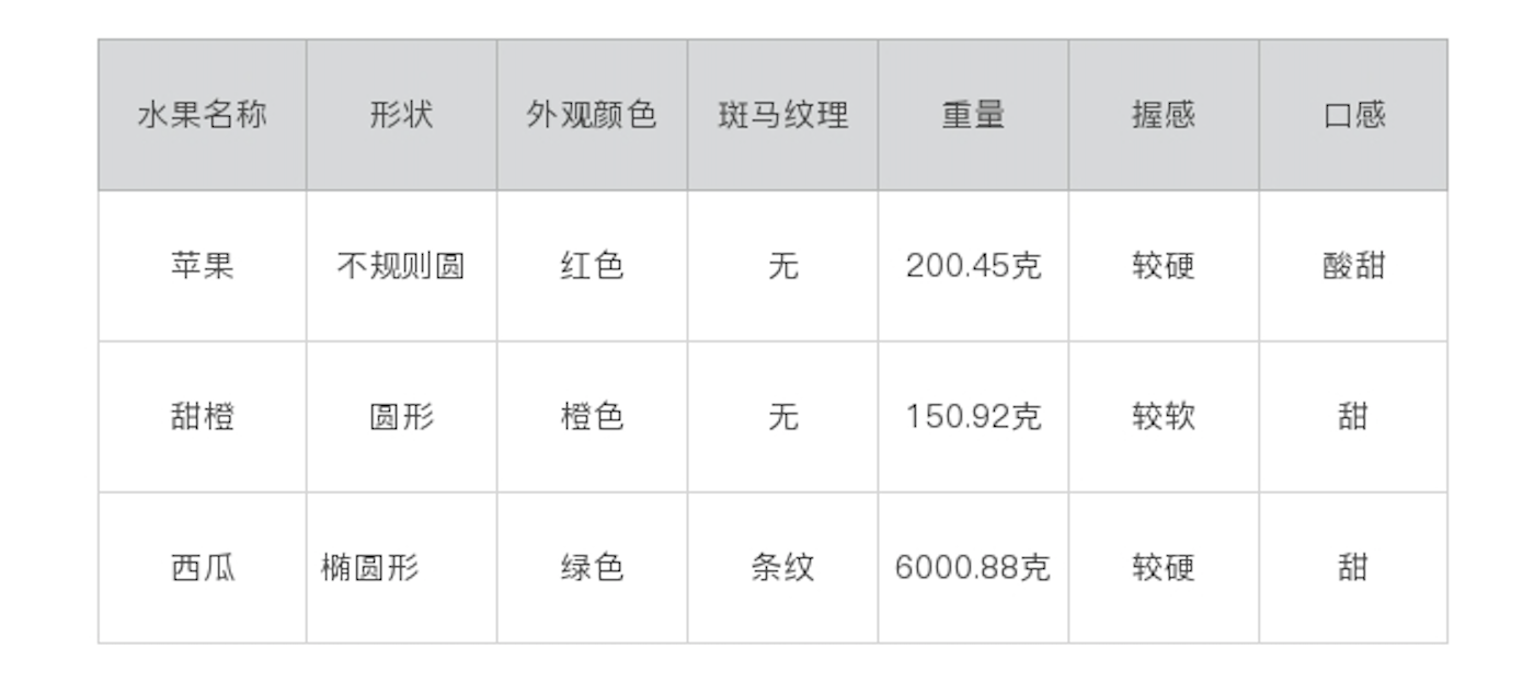 以水果为例,你会提取它们的哪些属性呢?我会考虑这些,比如:形状、外皮颜色、斑马纹理、重量、握感、口感。我手边刚好有一个苹果、一个甜橙和一个西瓜,我把它们的属性分别统计了一下,你可以看看。