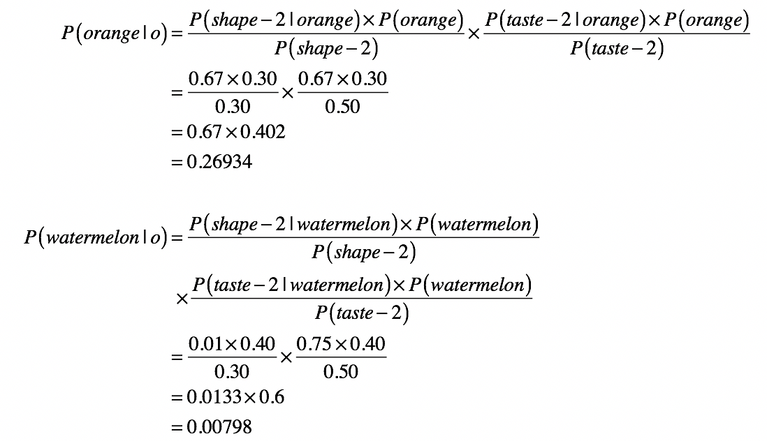 其中,apple表示分类为苹果,shape-2表示形状属性的值为2(也就是圆形),taste-2表示口感属性的值为2。以此类推,我们还可计算该水果属于甜橙和西瓜的概率。