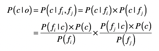 别急,朴素贝叶斯在这里就要发挥作用了。这是基于一个简单假设建立的一种贝叶斯方法,并假定数据对象的不同属性对其归类影响时是相互独立的。此时若数据对象o中同时出现属性fi与fj,则对象o属于类别c的概率就是这样:
