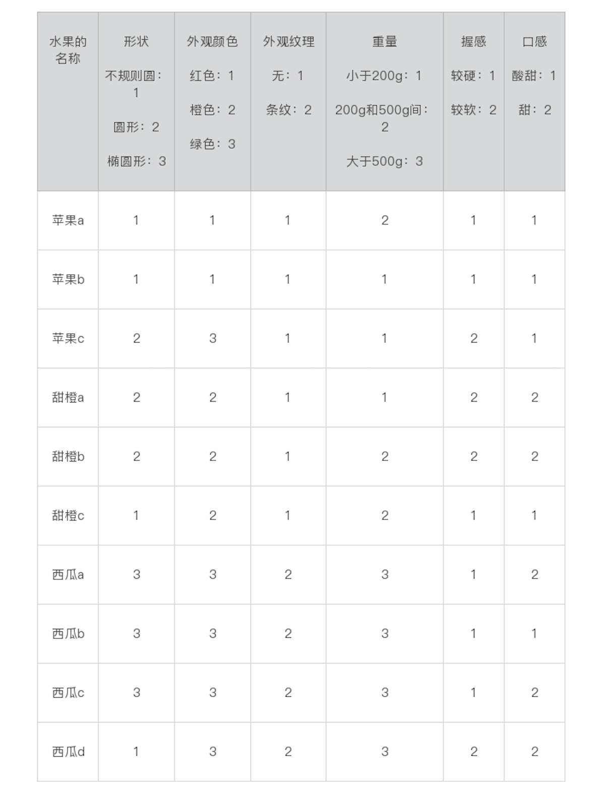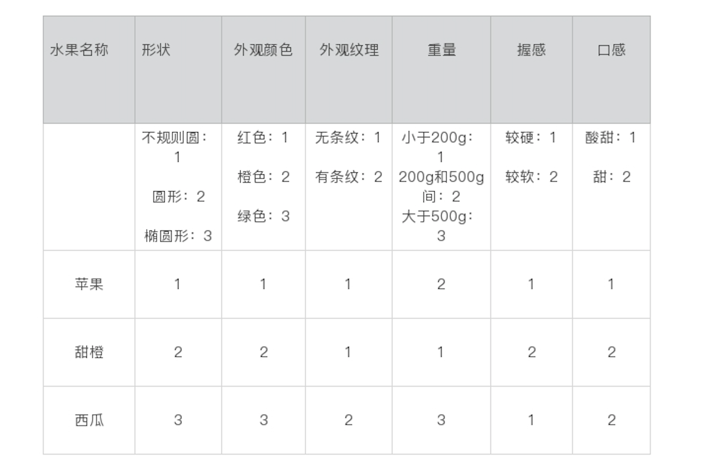 事实上,计算机并不像两三岁的小孩那样,可以看到水果的颜色、形状和纹理,或者能尝到水果的味道。我们需要将水果的特征转化为计算机所能理解的数据。最常用的方式就是提取现实世界中的对象之属性,并将这些转化为数字。