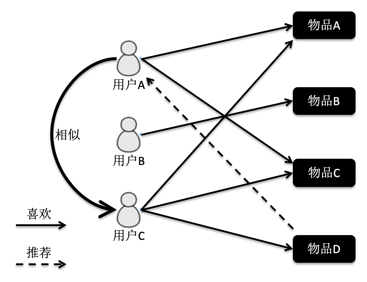 根据这张图的访问关系来看,用户A访问了物品A和C,用户B访问了物品B,用户C访问了物品A,C和D。我们计算出来,用户C是A的近邻,而B不是。因此系统会更多地向用户A推荐用户C访问的物品D。