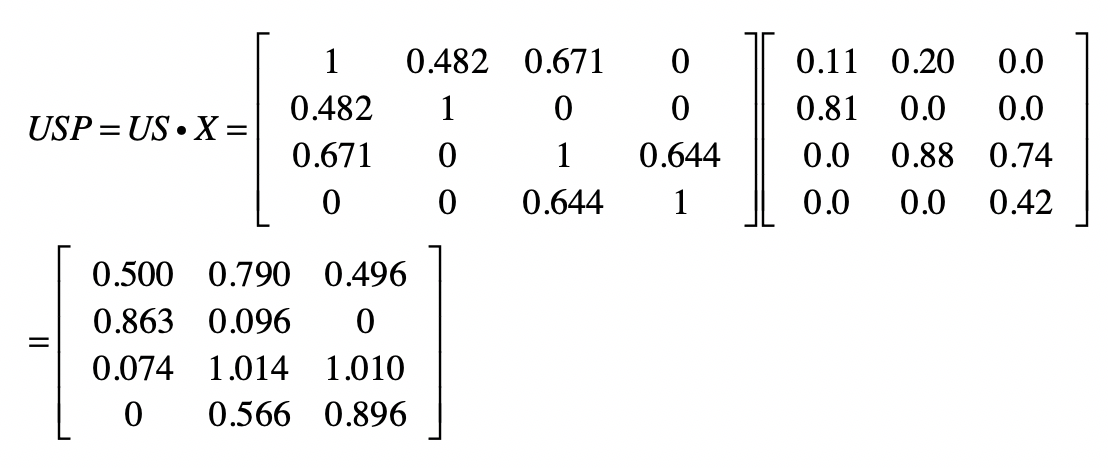 为了实现上面这个公式的分子部分,我们可以使用$US$和$X$的点乘。我们假设点乘后的结果矩阵为$USP$。这里我列出了根据示例计算得到的矩阵$USP$。