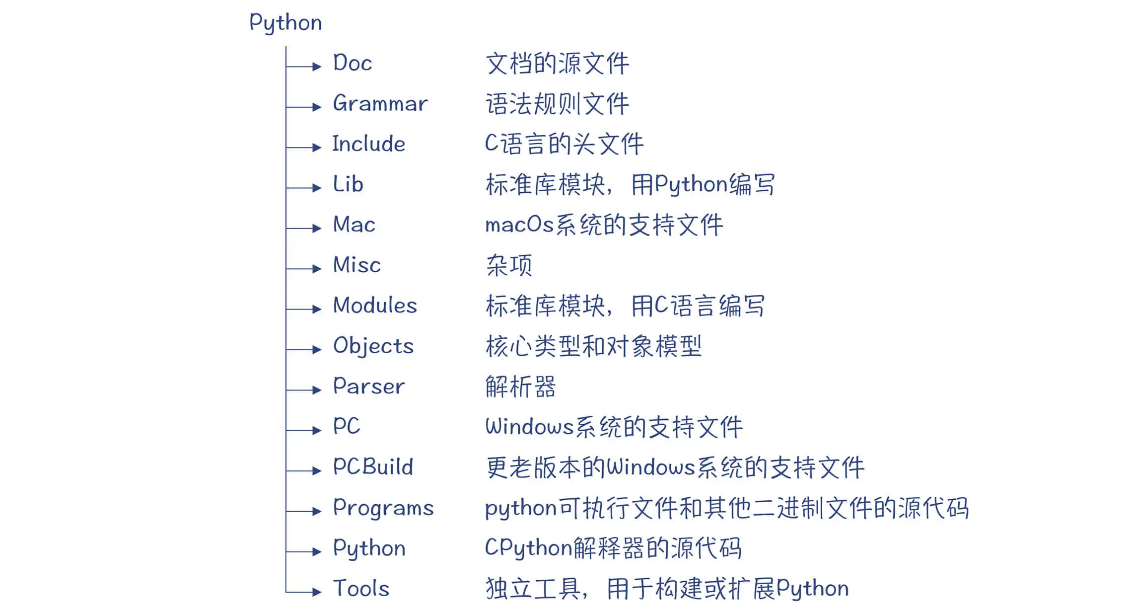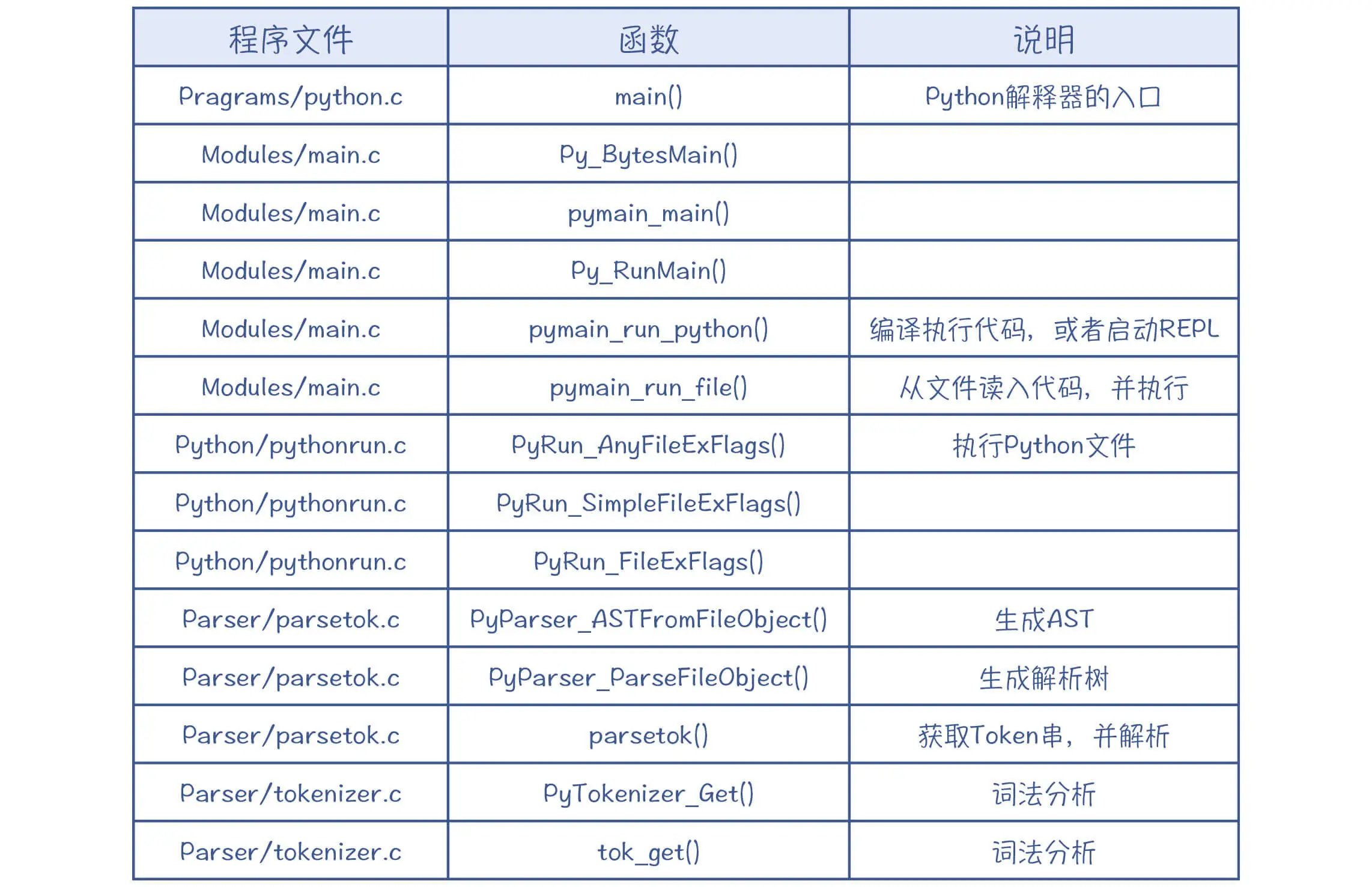 - 之后是Python/pythonrun.c文件,这是Python的解释器,它调用词法分析器、语法分析器和字节码生成功能,最后解释执行。