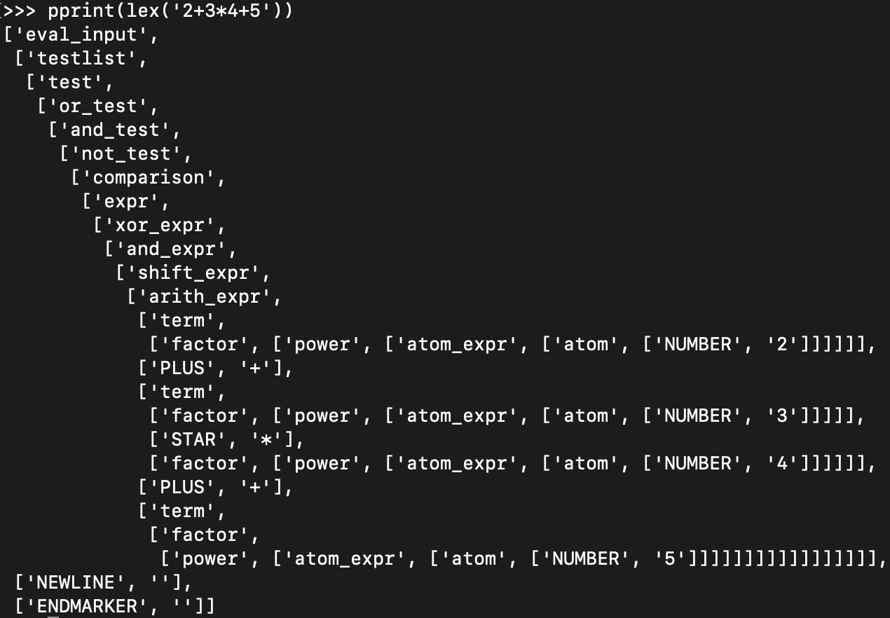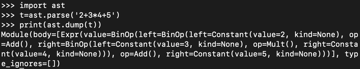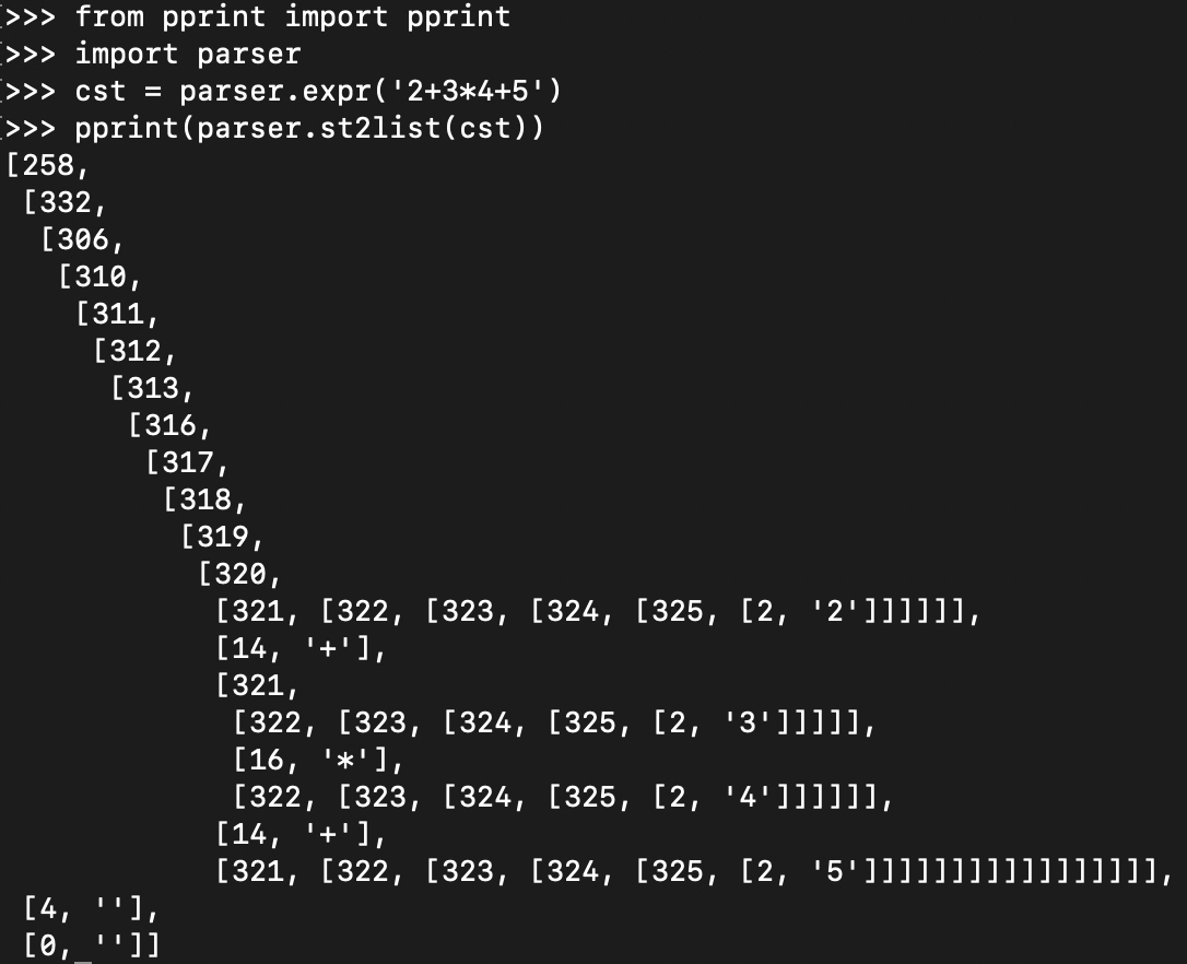 >>> cst = parser.expr('2+3+4') //对加法表达式做解析
