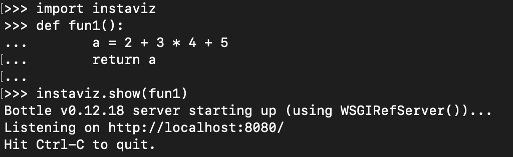 如果你嫌这样不够直观,还可以用另一个工具“instaviz”,在命令行窗口用pip命令安装instaviz模块,以图形化的方式更直观地来显示AST。instaviz是“Instant Visualization”(立即可视化)的意思,它能够图形化显示AST。