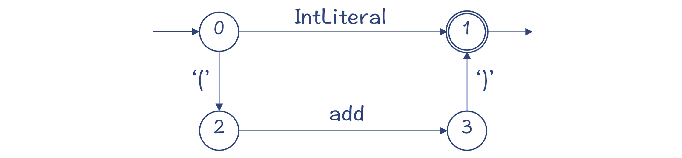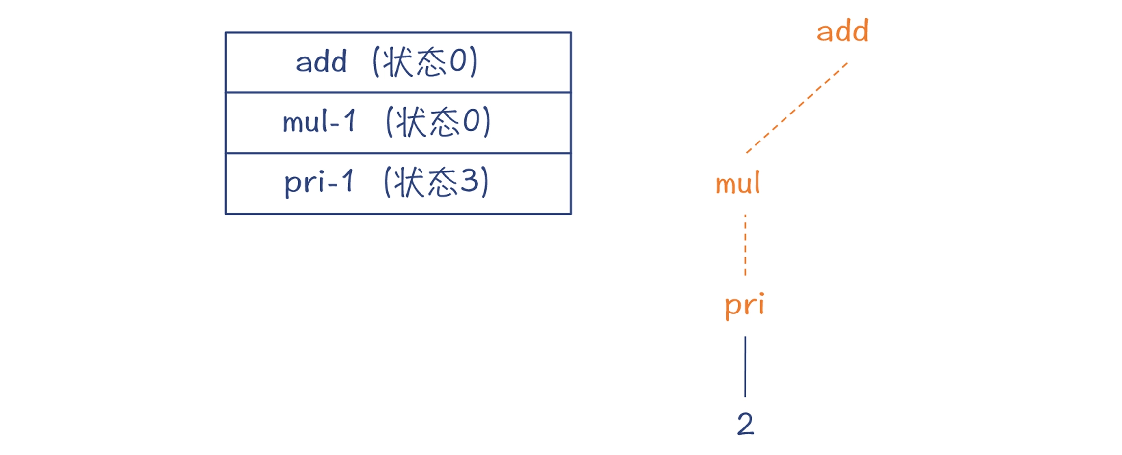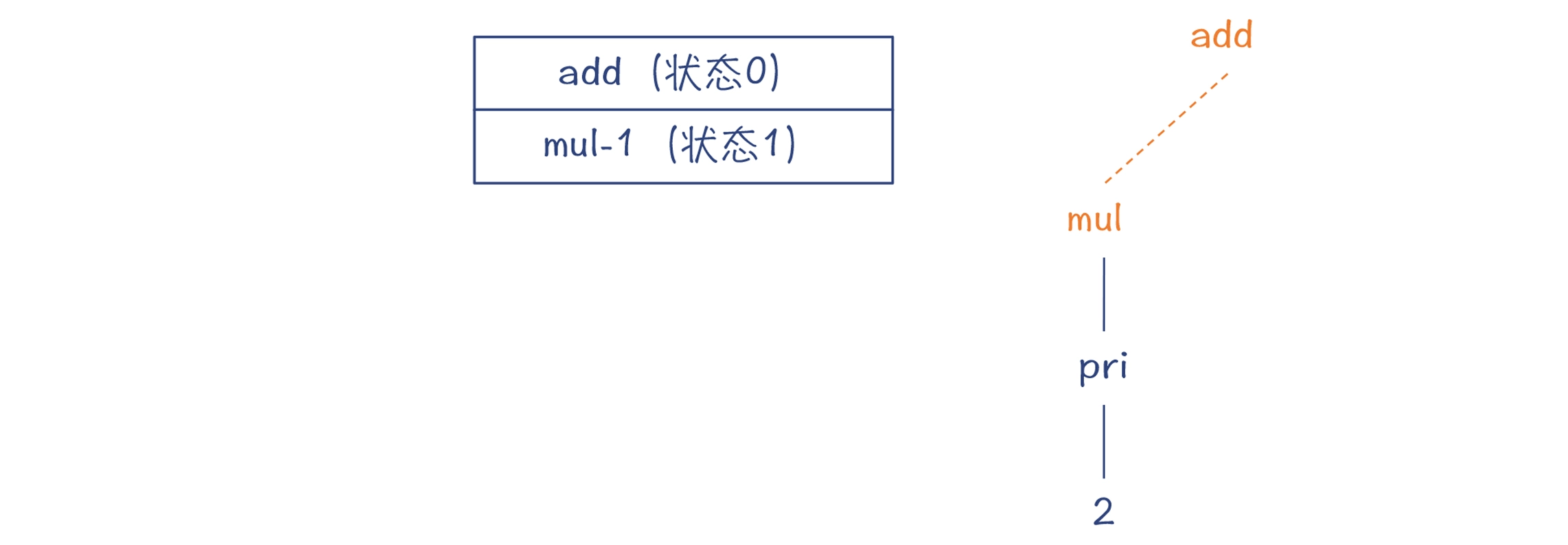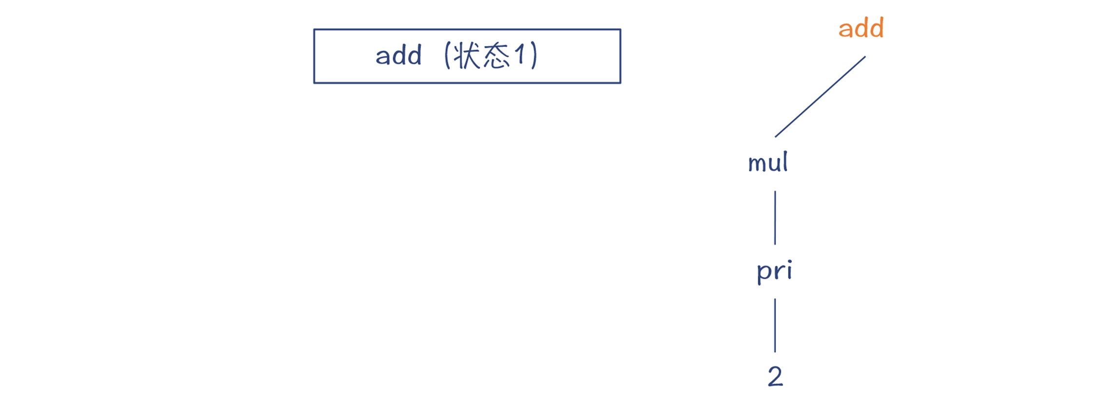 第1步,匹配add规则。把add对应的DFA压到栈里,此时该DFA处于状态0。这时候预读了一个Token,是字面量2。