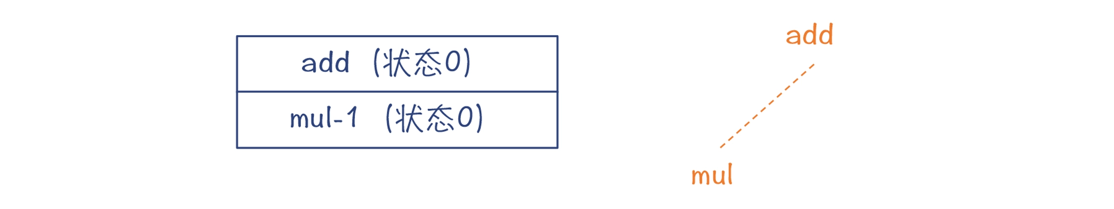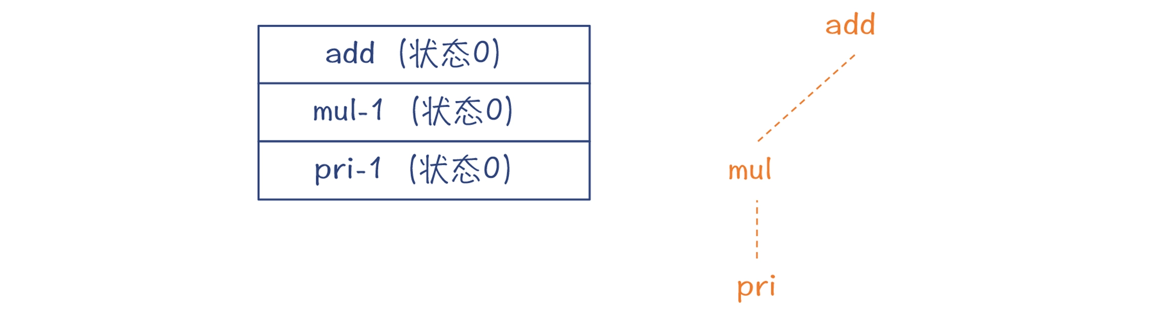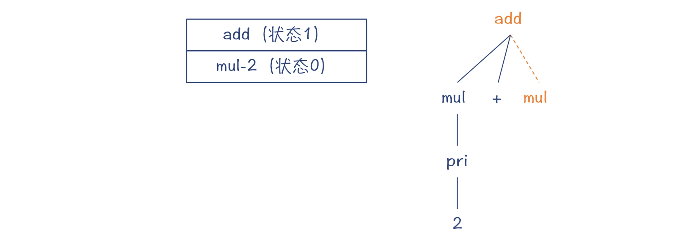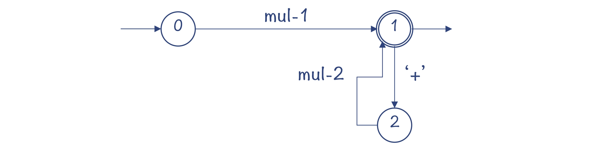 第2步,根据add的DFA,走mul-1这条边,去匹配mul规则。这时把mul对应的DFA入栈。在示意图中,栈是从上往下延伸的。