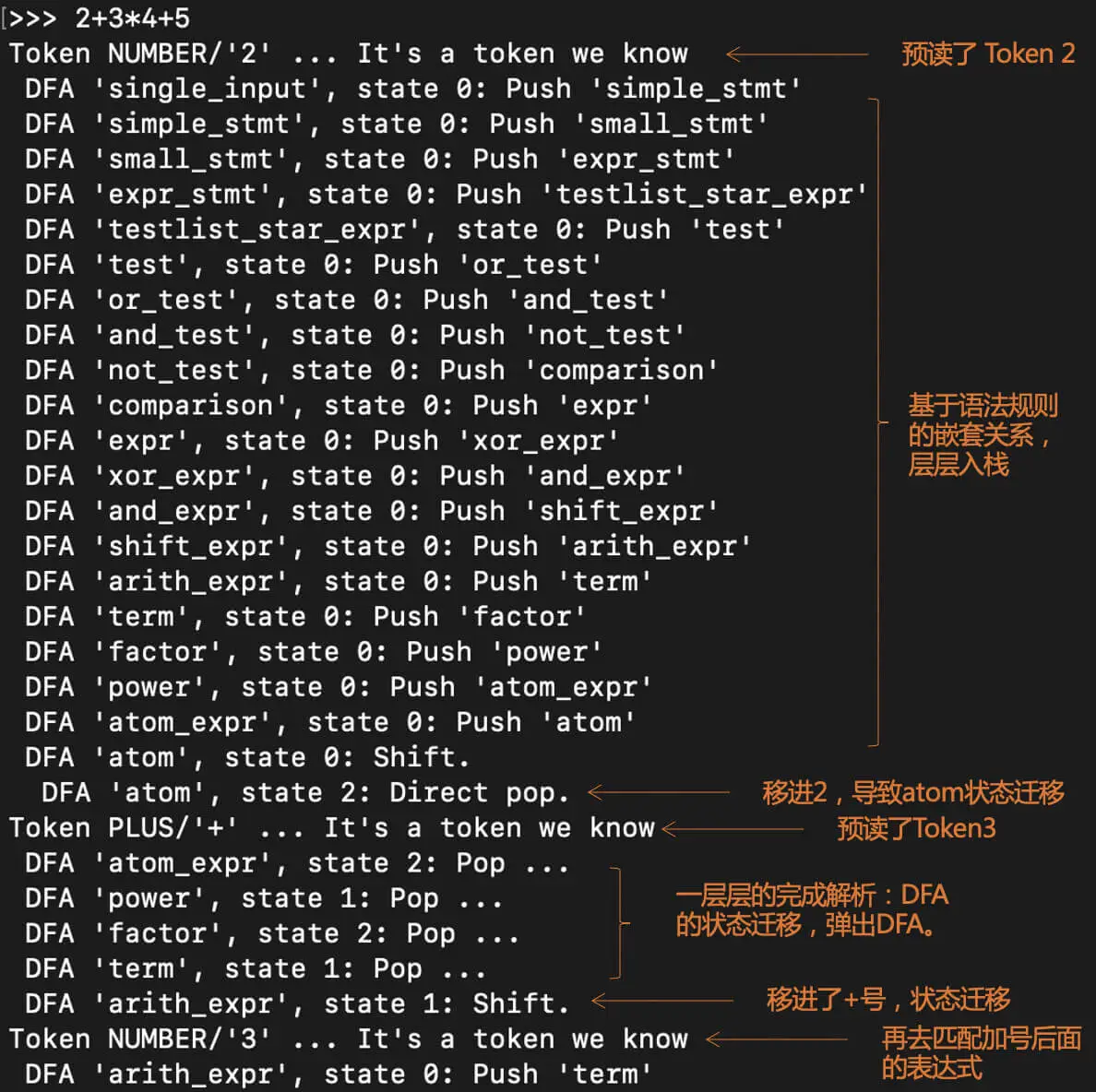 你还可以用“-d”参数运行python,然后在REPL里输入程序,这样它就能打印出这些调试信息,包括什么时候把DFA入栈、什么时候出栈,等等。我截取了一部分输出信息,你可以看一下。