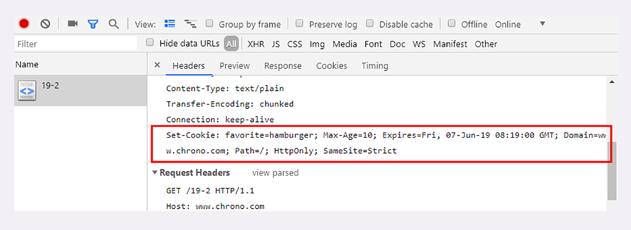 下面这个截图是实验环境“/19-2”的响应头,我来对着这个实际案例讲一下都有哪些常见的Cookie属性。